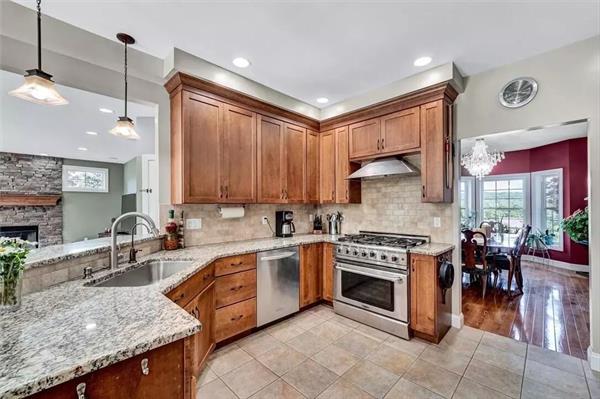 Open concept eat in kitchen with granite counters stainless steel appliances and dishwasher.